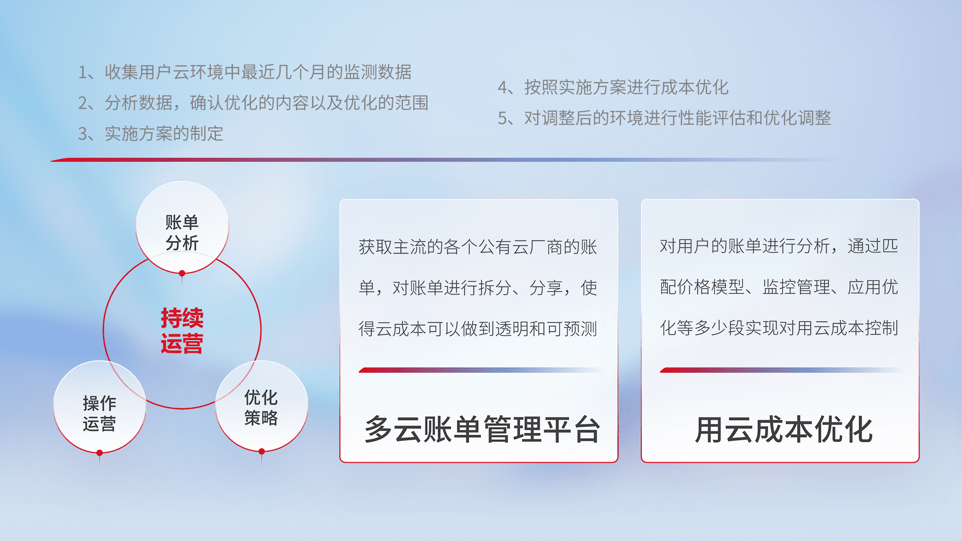 通过多云纳管,,,以统一的资源数据模型把客户的云资源进行抽象和封装,,进而实现对多云资源的统一操作,,,,保障云资源管理的可靠性、、、、稳定性与可用性。。。。量身定制化运维内容,,,,配置、、、开发运维、、、、补丁管理、、、、备份、、监控、、认证和访问管理、、、、审计和日常巡检等,,,保障在用云过程中的可靠度,,,,稳定度以及高可用率。。。。